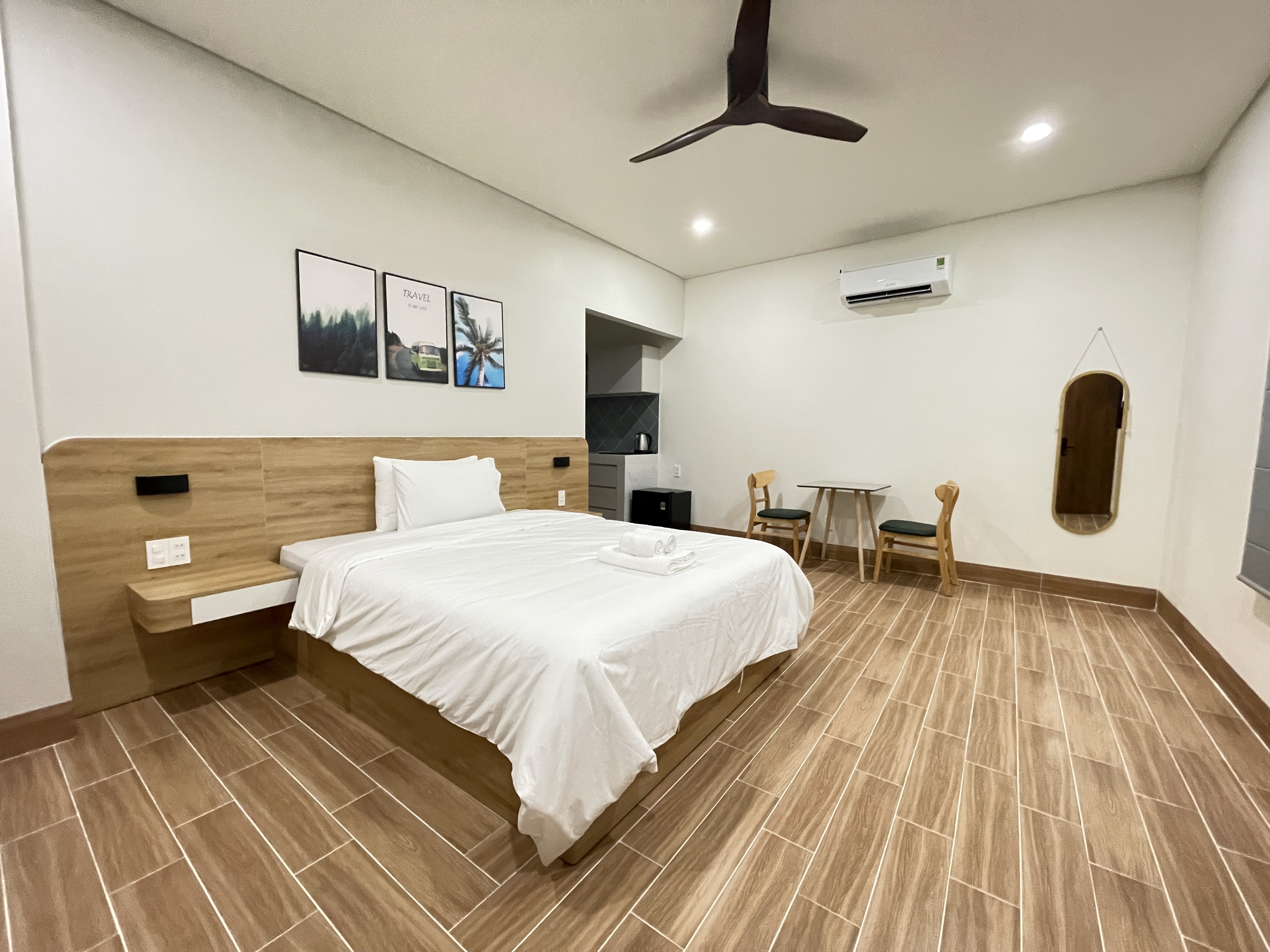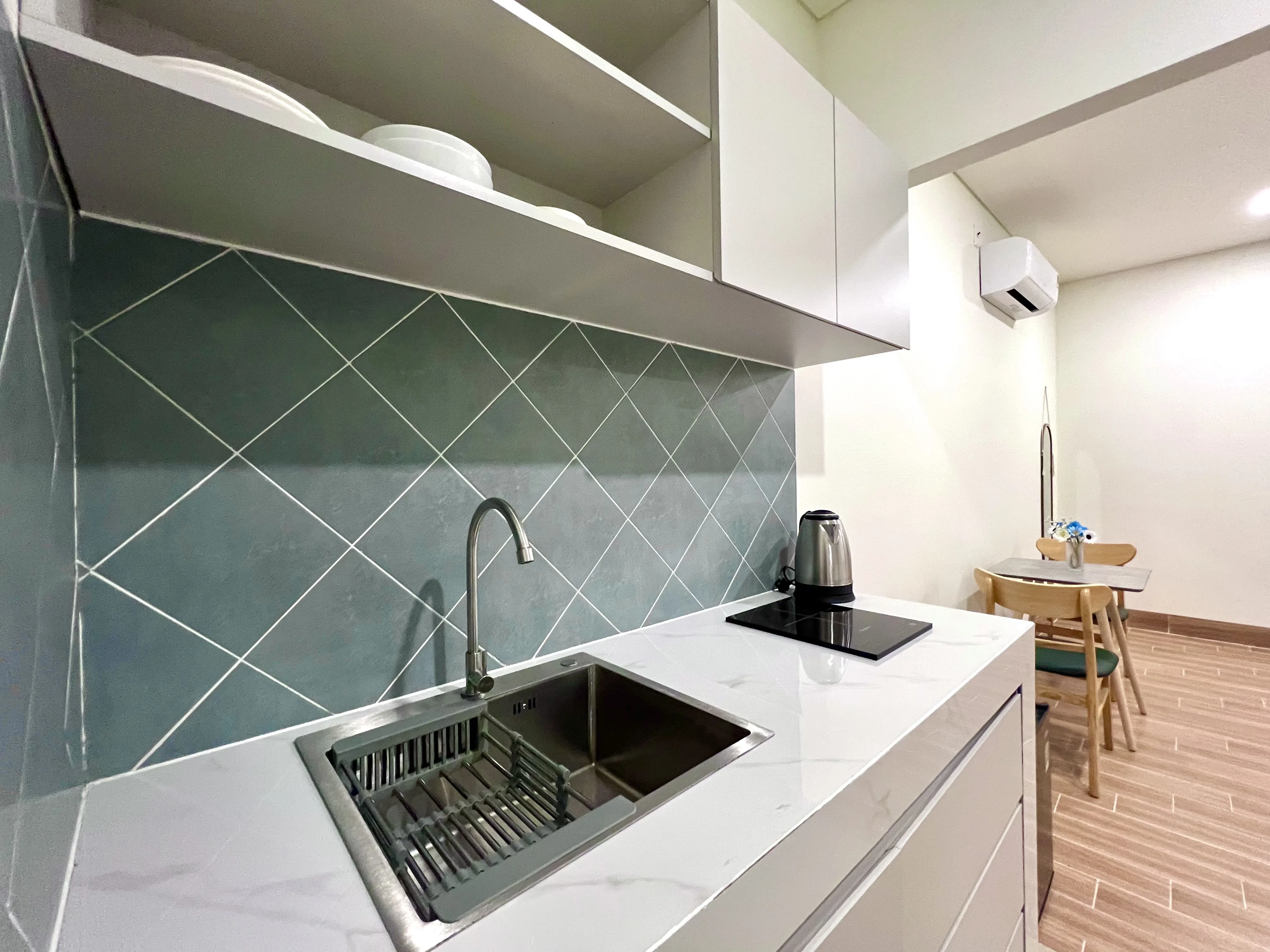 Phòng studio được thiết kế theo phong cách căn hộ thu nhỏ có bếp dành riêng cho quý khách, hộ gia đình bạn bè lưu trú dài ngày cần không gian nấu ăn như chính ngôi nhà của mình.